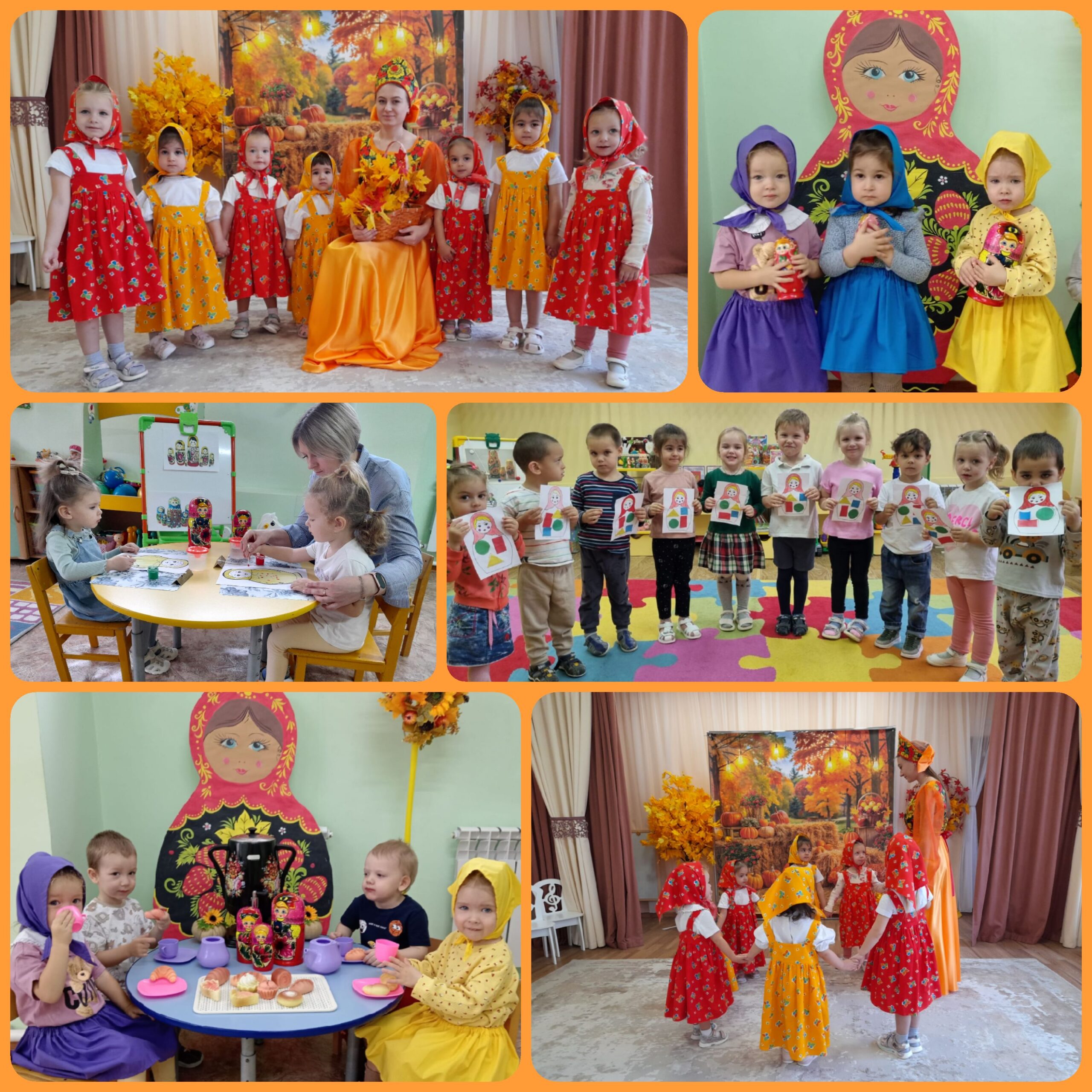 Веселый праздник! Матрешка – поистине волшебная игрушка! Как удивительно, что одна прячется внутри другой! Наши малыши групп № 2 «Семицветик и № 1 «Колобок» познакомились  с миром этих разноцветных красавиц. Самые маленькие попробовали необычный способ рисования — «тычком», создав свои неповторимые узоры. Воспитатель вместе с детьми затем развернул сюжетно-ролевую игру – устроил настоящее чаепитие в гостях у матрешки! Дети постарше сделали аппликации с изображением матрешек. Завершился тематический день веселыми танцами,...